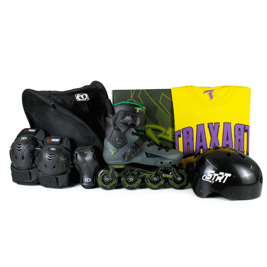 O Kit Completo inclui Patins Revolt Verde, Capacete STRT Preto, Protetor DR-029 e Mochila Inline Bag Preta.