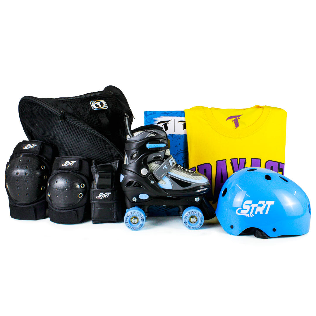 O Kit infantil inclui Patins Flash Azul, Protetor Juvenil SSE-611, Capacete STRT Azul Claro e Mochila Inline Bag.