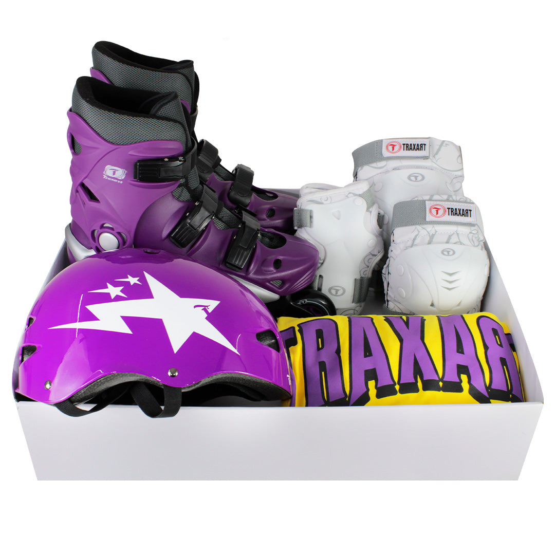 O Kit Iniciante inclui Patins Spectro Roxo, Capacete Intermediário Flying Star e Kit de Proteção DK-619.