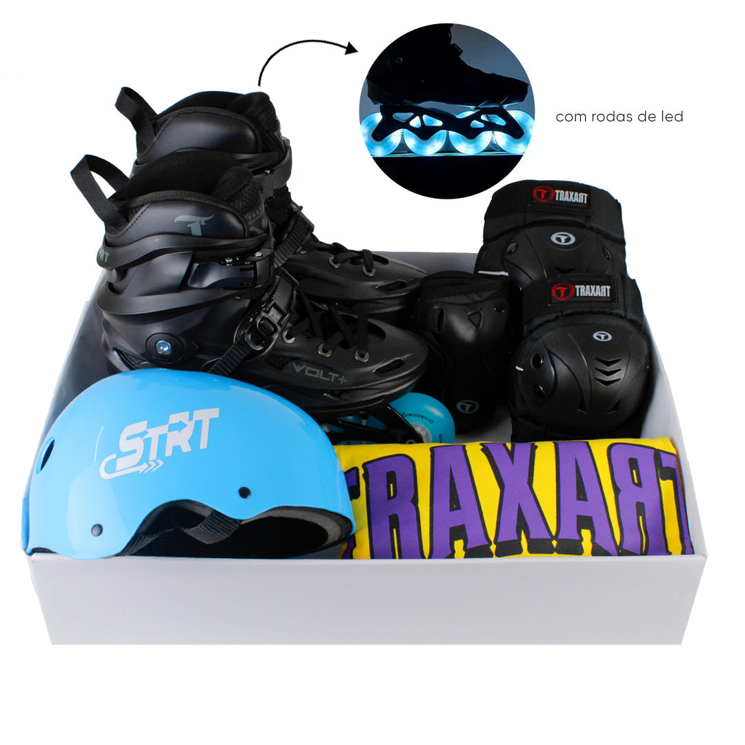 O Kit Intermediário inclui Patins Volt Preto, Capacete STRT Azul, Protetor DR-029 e agora com Rodas de LED Azul. Esse kit é uma ótima opção para você que curte passeios ou está iniciando na prática do freestyle urban, o Patins possui agilidade e firmeza, ajudando na evolução da patinação. Seus acessórios são de excelente qualidade, permitindo mobilidade completa para melhor performance no esporte. As luzes LED adicionam um toque de brilho e visibilidade, tornando cada passeio mais divertido, especialmente à noite.