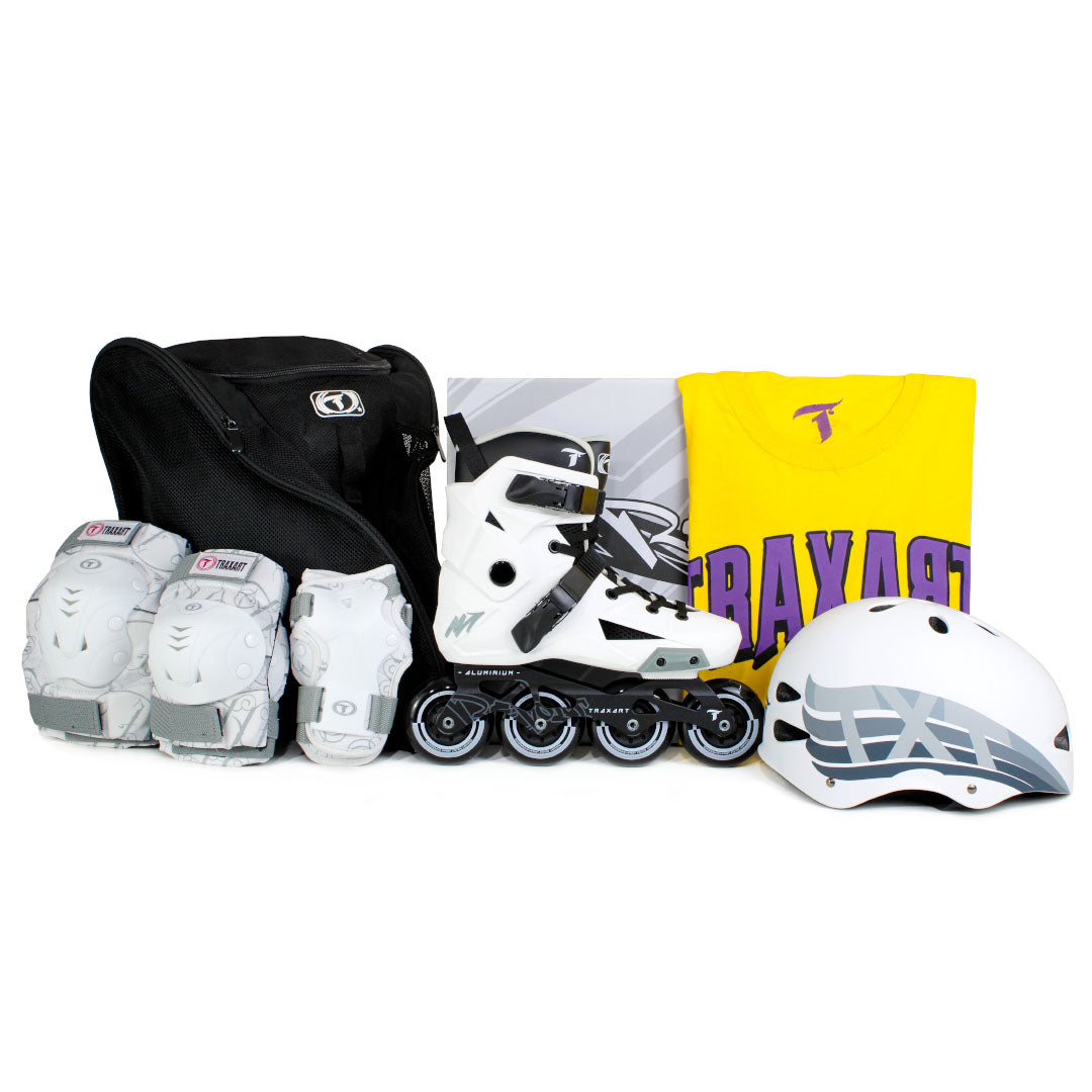 O Kit Premium inclui Patins Revolt Branco, Capacete Intermediário AIR WHITE, Protetor DK-619 e Mochila Inline.