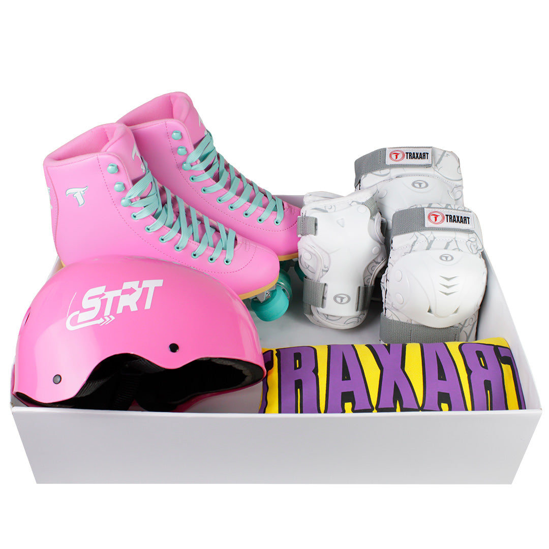 O Kit inclui o Patins Foxxy Rosa, Capacete STRT Rose e Protetor DK-619.