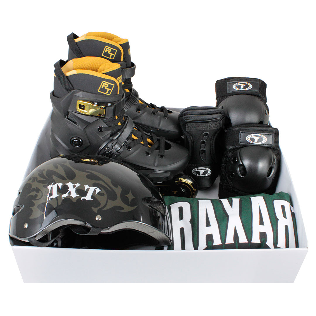 O Kit Avançado inclui  Patins Revolt Turbo Gold, Capacete Intermediário Biker, e Protetor SSE-613.