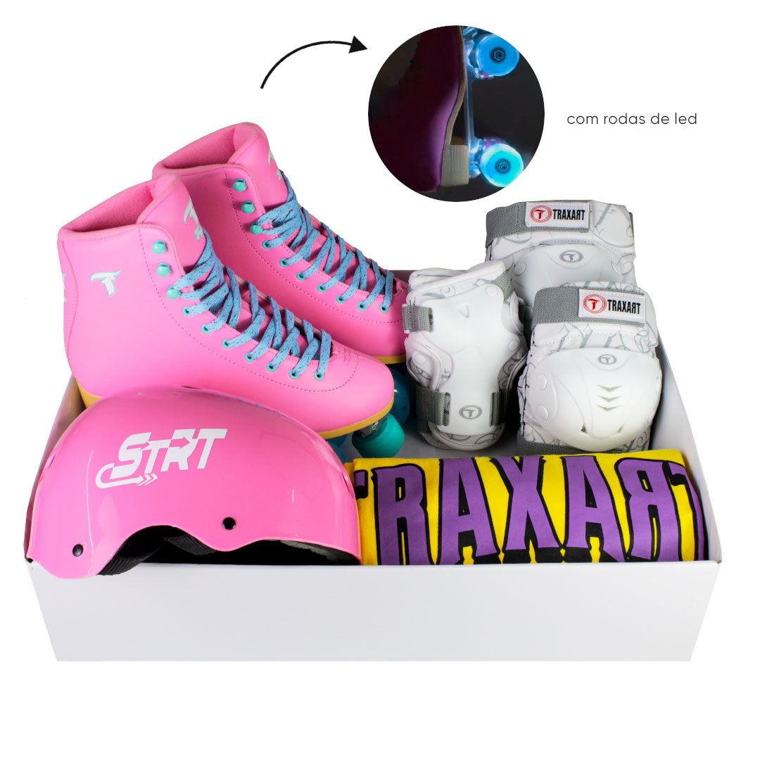 O Kit inclui o Patins Foxxy Rosa, Capacete STRT Rose, Protetor DK-619, Rodas de LED Azul e Cadarço Refletivo Azul.