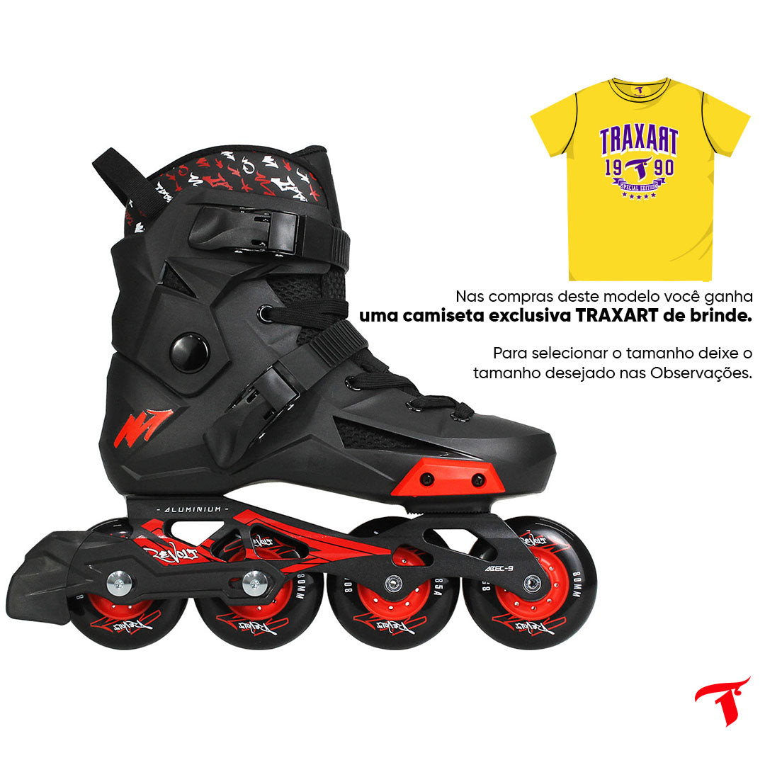 O modelo Revolt é um patins de bota rígida com design arrojado, ideal para a prática do urban. Conta com protetor para slide, sistema de absorção de impacto no calcanhar e bota interna acolchoada para maior conforto. Possui três tipos de fechamento (trava superior, cadarço e trava central) para mais firmeza. A base é de alumínio universal, as rodas são de PU 80mm, dureza 85A e cubo fechado, com rolamentos ABEC-9 que garantem maior velocidade.