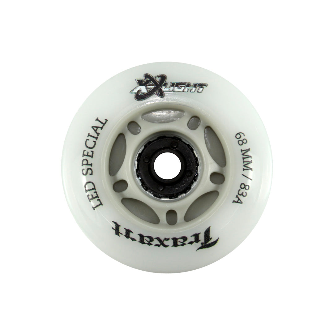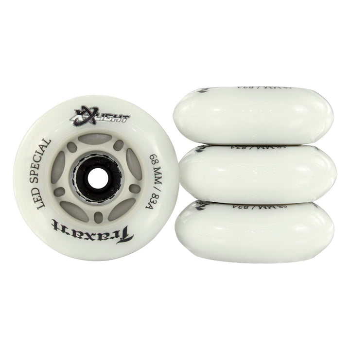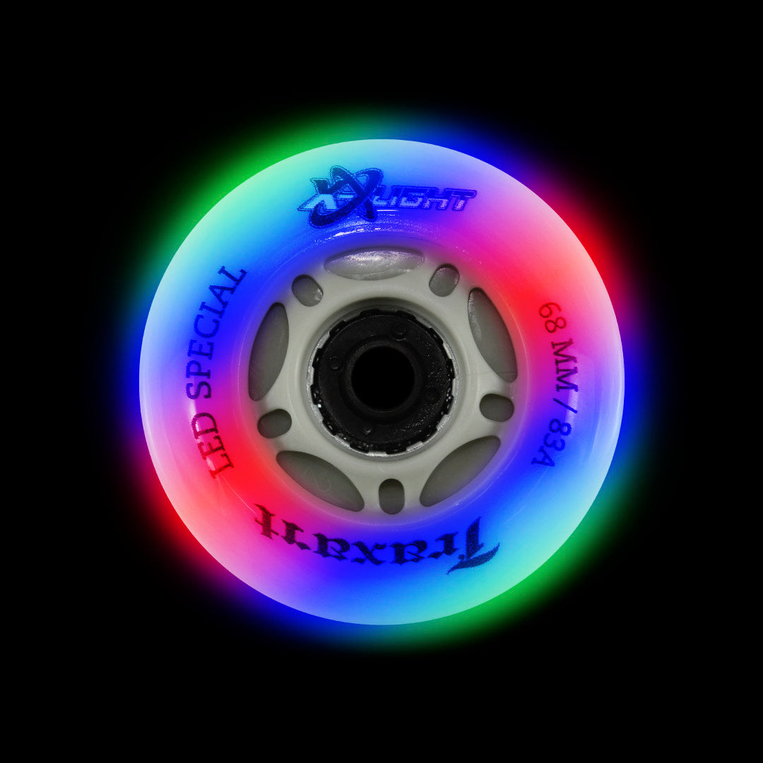 O jogo de 4 rodas inline Traxart LED Special 68mm são rodas de poliuretano (PU) em 68mm com dureza 83A. Essas são as rodas que vem no Patins X-Light.