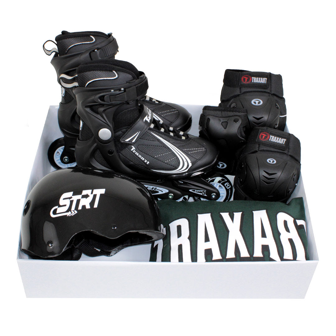 O Kit Iniciante inclui Patins Faster, Capacete STRT Preto e Kit de Proteção DR-029.